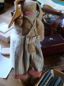 En dan komt, voorzichtig en stapsgewijs Bunny tot leven....knipje in de broek voor het staartje, even passen, staat het leuk ? is het broekje niet te wijd of te lang ?past de staart eruit....